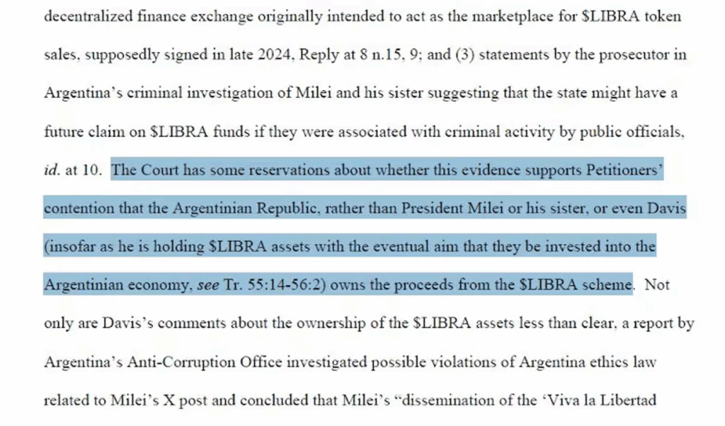 Los fondos Palladian Partners, HBK Master Fund, Hirsh Group y Virtual Emerald International Limited habían solicitado autorización para obtener pruebas en Estados Unidos, con la intención de vincular al país con los ingresos generados por el proyecto digital impulsado por Davis y promocionado por Milei en la red social X. Sin embargo, Rochon consideró que las evidencias presentadas eran endebles y basadas en “artículos periodísticos, posteos en redes y un supuesto acuerdo preliminar con una plataforma de intercambio”, lo que no alcanzaba para sostener una relación directa con el Estado.