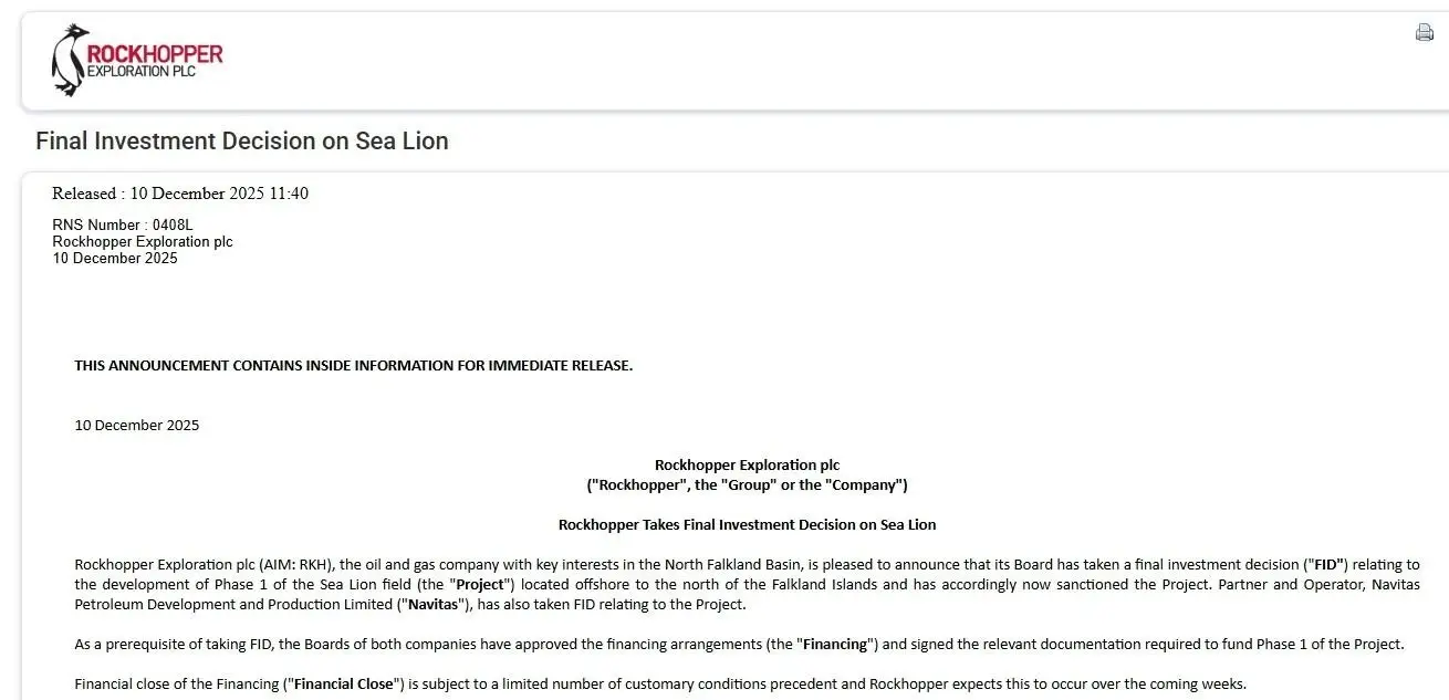 Rockhopper señaló en un comunicado al que accedió El Destape que “la Junta Directiva ha tomado una decisión final de inversión (FID, por sus siglas en inglés) relacionada con el desarrollo de la Fase 1 del campo Sea Lion, ubicado en alta mar al norte de las islas Malvinas y, en consecuencia, ha aprobado el Proyecto”.