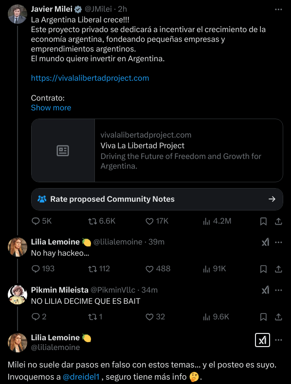 La gente compraba, algunos ya vendían. El caos y la desinformación reinaban en X, que ya se estaba preparando para una nueva «noche twittera». Aún no había confirmación oficial más que ese posteo y la página web. Había voceros, como la diputada Lilia Lemoine, aclarando que era real. Que no había sido hackeado.
