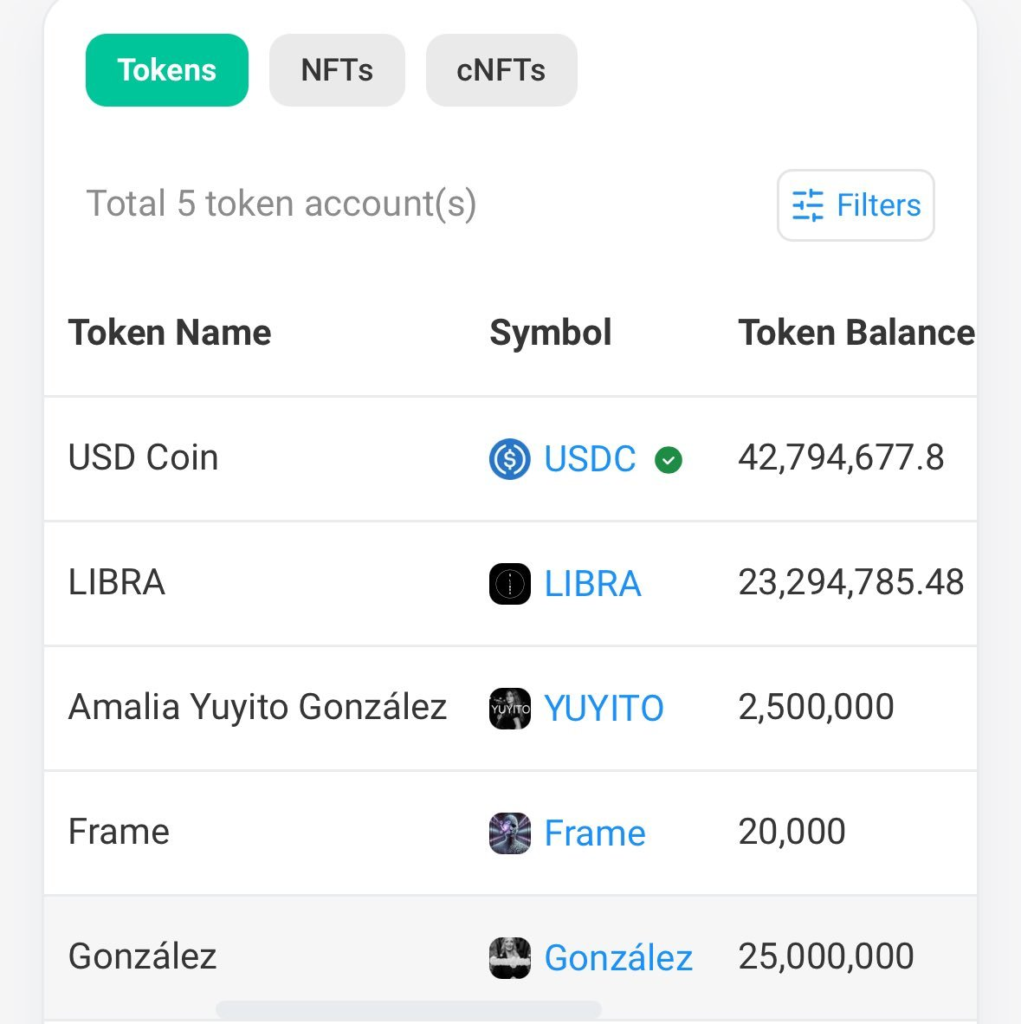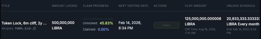 2. Hay una wallet que maneja el 50% del supply Esto es 100% cierto. Hay una wallet que, al día de hoy, mantiene el 50% del supply total de $LIBRA . Son unos 500 M de $LIBRAs . Lo que nunca se aclaró es que ese 50% del supply está en un contrato inteligente haciendo vesting por dos años. Le permite sacar al depositante (Kelsier Ventures) de a 20 M de $LIBRAs por mes y tuvo un su cliff en Agosto 2025.
