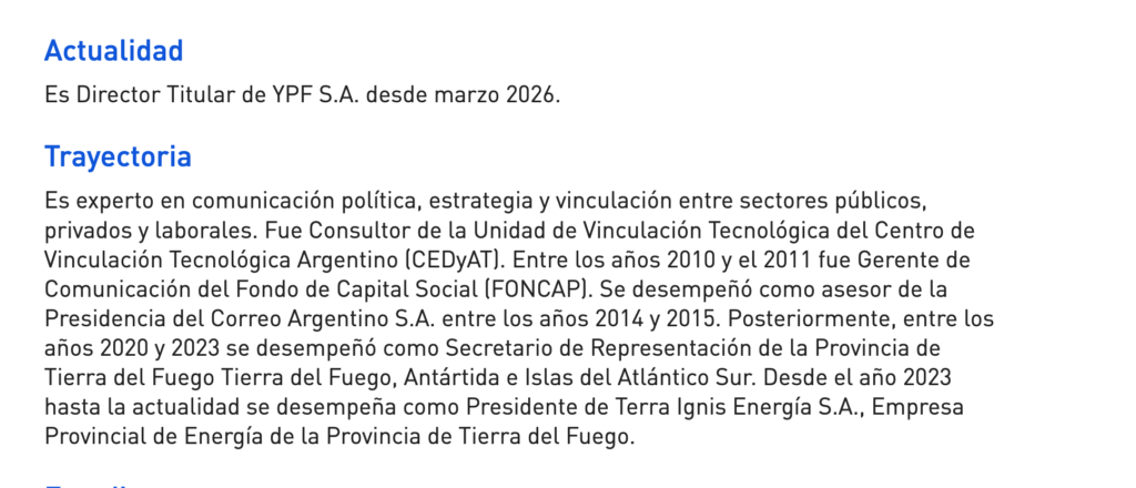 BUENOS AIRES, 25 de marzo de 2026 — La composición del directorio de YPF, la empresa de mayoría estatal que concentra el 51% de las acciones, ha sido objeto de permanentes reconfiguraciones políticas desde la asunción del presidente Javier Milei. Con la reciente designación del jefe de Gabinete Manuel Adorni como director titular Clase A —el puesto con poder de veto por la Acción de Oro— Se le suma la figura de Maximiliano D´alessio de la provincia de Tierra del Fuego, actual titular de Terra Ignis como parte del acuerdo político entre Melella y Milei.
