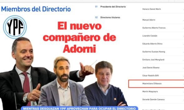 BUENOS AIRES, 25 de marzo de 2026 — La composición del directorio de YPF, la empresa de mayoría estatal que concentra el 51% de las acciones, ha sido objeto de permanentes reconfiguraciones políticas desde la asunción del presidente Javier Milei. Con la reciente designación del jefe de Gabinete Manuel Adorni como director titular Clase A —el puesto con … Sigue leyendo YPF: Cambios en el directorio y aparece Maximiliano D’alessio por Tierra del Fuego que pasará a ganar más de $100 Millones