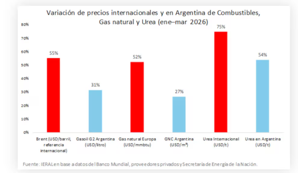 Ese movimiento fue impactante. Entre enero y marzo, el precio internacional del petróleo aumentó un 55%, mientras que el gas natural en Europa subió 52% y la urea —insumo clave para el agro— avanzó un 75%. En la Argentina, en cambio, las subas fueron más moderadas: 31% en gasoil, 27% en gas y 54% en fertilizantes.